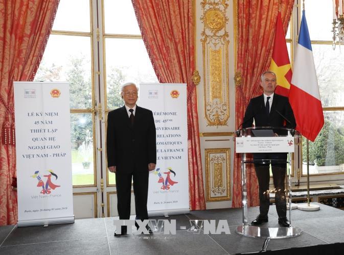 Tổng Bí thư nêu rõ, trong suốt 45 năm qua, kể từ khi thiết lập quan hệ ngoại giao, nước Pháp luôn là đối tác hàng đầu của Việt Nam ở châu Âu cũng như trên thế giới. Quan hệ với Pháp giữ vị trí ưu tiên trong chính sách đối ngoại của Việt Nam. Các mối quan hệ trao đổi giữa hai nước trong khuôn khổ song phương cũng như đa phương, phát triển ngày càng phong phú, đa dạng, cho phép hai bên tham khảo và chia sẻ quan điểm gần gũi trên nhiều vấn đề khu vực và quốc tế. Sự hiện hữu của Pháp tại Việt Nam vẫn tồn tại cùng thời gian qua các công trình kiến trúc suốt từ Bắc đến Nam như Nhà hát Lớn Hà Nội, cầu Long Biên hay Bưu điện trung tâm Thành phố Hồ Chí Minh…