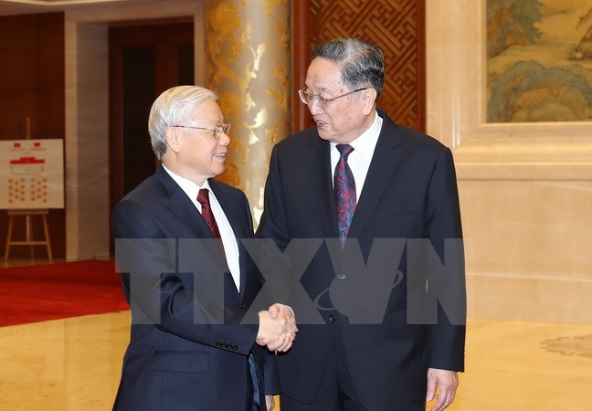 | Tổng Bí thư Nguyễn Phú Trọng hội kiến với Ủy viên Thường vụ Bộ Chính trị, Chủ tịch Chính hiệp Trung Quốc Du Chính Thanh. |