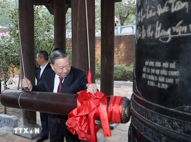 | Tổng Bí thư Tô Lâm thỉnh chuông tại Đền Chung Sơn - Đền thờ gia tiên Bác Hồ ở Nghệ An. Ảnh: TTXVN |