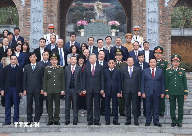 | Tổng Bí thư Tô Lâm và đoàn công tác Trung ương tại Đền Chung Sơn - Đền thờ gia tiên Bác Hồ. Ảnh: TTXVN |
