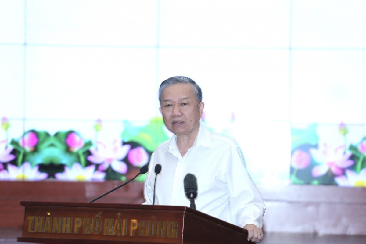 Sau khi chỉ rõ những tồn tại hạn chế và thách thức của thành phố trong thời gian qua, Tổng Bí thư Tô Lâm nhấn mạnh, Hải Phòng cần nỗ lực phấn đấu phát triển thành phố ngang tầm với các thành phố tiêu biểu ở châu Á, là thành phố cảng quốc tế hiện đại, đi đầu cả nước trong sự nghiệp công nghiệp hóa, hiện đại hóa, là một trung tâm quốc tế về kinh tế, giáo dục, đào tạo, khoa học - công nghệ, đời sống vật chất và tinh thần của nhân dân không ngừng được nâng cao như các mục tiêu mà Nghị quyết số 45 của Bộ Chính trị đã đề ra.