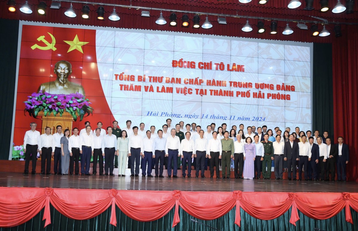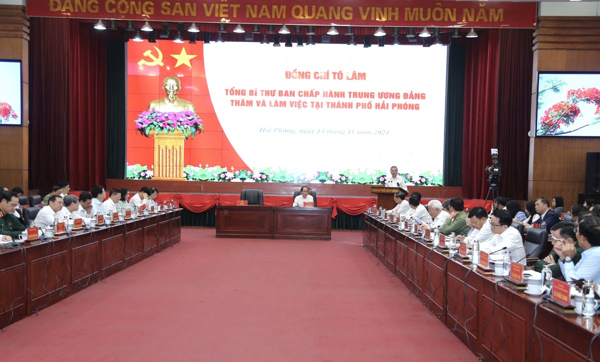 Tiếp ngày thăm và làm việc tại Hải Phòng, chiều cùng ngày Tổng Bí thư Tô Lâm làm việc với Ban chấp hành Đảng bộ TP. Hải Phòng về kết quả thực hiện Nghị quyết Đại hội lần thứ XIII của Đảng, Nghị quyết Đại hội XVI Đảng bộ thành phố; quán triệt, triển khai thực hiện Chỉ thị số 35-CT/TW của Bộ Chính trị và tình hình triển khai thực hiện Kết luận số 96-KL/TW của Bộ Chính trị về tiếp tục thực hiện Nghị quyết số 45-NQ/TW của Bộ Chính trị về xây dựng và phát triển thành phố Hải Phòng đến năm 2030, tầm nhìn đến năm 2045.