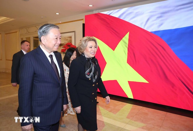 Chủ tịch Hội đồng Liên bang Nga Valentina Matviyenko nhiệt liệt chào mừng Tổng Bí thư Tô Lâm và Đoàn đại biểu cấp cao Việt Nam, khẳng định chuyến thăm là dấu mốc quan trọng trong quan hệ hai nước, diễn ra đúng vào dịp hai bên kỷ niệm hàng loạt sự kiện lịch sử trọng đại: 75 năm thiết lập quan hệ ngoại giao Việt - Nga, 80 năm Chiến thắng trong Chiến tranh Vệ quốc, 50 năm Ngày Giải phóng miền Nam, thống nhất đất nước và 80 năm Ngày Quốc khánh Việt Nam. Bà Matviyenko cũng gửi lời chúc mừng nồng nhiệt đến nhân dân Việt Nam nhân kỷ niệm 71 năm Chiến thắng Điện Biên Phủ, một biểu tượng bất khuất của khát vọng độc lập, tự do.