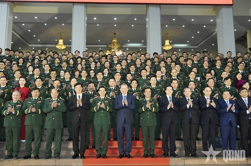 | Tổng Bí thư Tô Lâm với các đại biểu tại Bộ Tư lệnh Bộ đội Biên phòng. Ảnh: Trọng Đức/TTXVN |