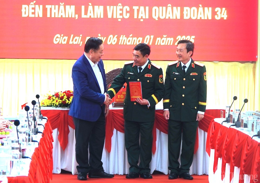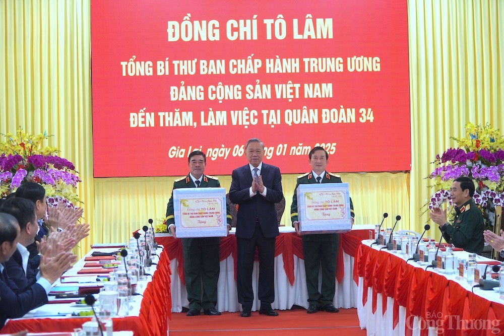 Trong không khí phấn khởi những ngày đầu năm mới 2025, Tổng Bí thư Tô Lâm tặng quà và gửi lời chúc sức khỏe, hạnh phúc, năm mới thắng lợi mới tới toàn thể cán bộ, chiến sĩ, người lao động của Quân đoàn 34 và Binh đoàn 15; trao quà tặng các gia đình chính sách, người có công, các già làng, trưởng thôn, người có uy tín. Nhân dịp này, Đại tướng Phan Văn Giang và Đại tướng Lương Tam Quang đã trao quà tặng Quân đoàn 34, Binh đoàn 15 và các già làng, người có uy tín trên địa bàn. |