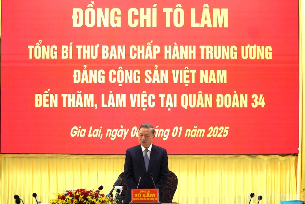 | Tổng Bí thư Tô Lâm phát biểu chỉ đạo tại buổi làm việc với Quân đoàn 34. |