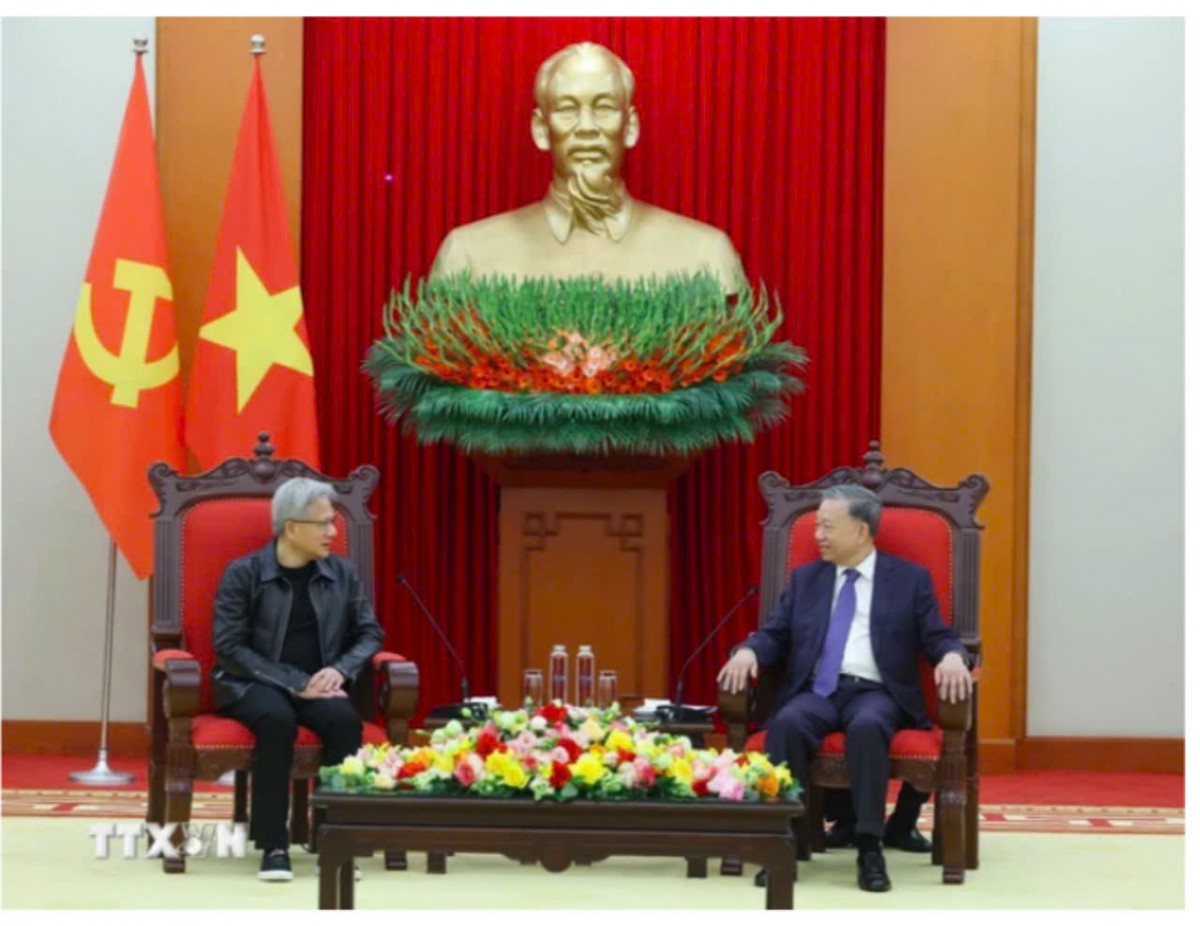 Tổng Bí thư Tô Lâm bày tỏ mong muốn Tập đoàn NVIDIA tiếp tục đồng hành với Việt Nam để phát triển hệ sinh thái AI, đẩy mạnh tính tự lực tự cường công nghệ; khẳng định Đảng, Nhà nước Việt Nam coi Tập đoàn NVIDIA là đối tác chiến lược hàng đầu trong lĩnh vực bán dẫn và AI, cam kết tạo điều kiện thuận lợi nhất để các nội dung hợp tác giữa hai bên được triển khai hiệu quả, đưa Việt Nam trở thành điểm sáng mới về công nghiệp bán dẫn, AI và đổi mới sáng tạo ở khu vực và thế giới, đồng thời đóng góp vào sự phát triển chung của kinh tế thế giới và văn minh nhân loại.