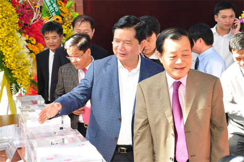 | Bộ trưởng Đinh La Thăng và Tiến sĩ Trần Đắc Sinh, Chủ tịch HĐQT HOSE kiểm tra niêm phong thùng phiếu trước khi đấu giá -Ảnh: Bá Thụy |