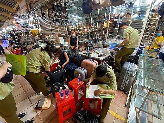 | Lực lượng QLTT kiểm tra, xử lý hàng loạt điểm bán hàng giả, hàng nhái tại chợ Bến Thành |