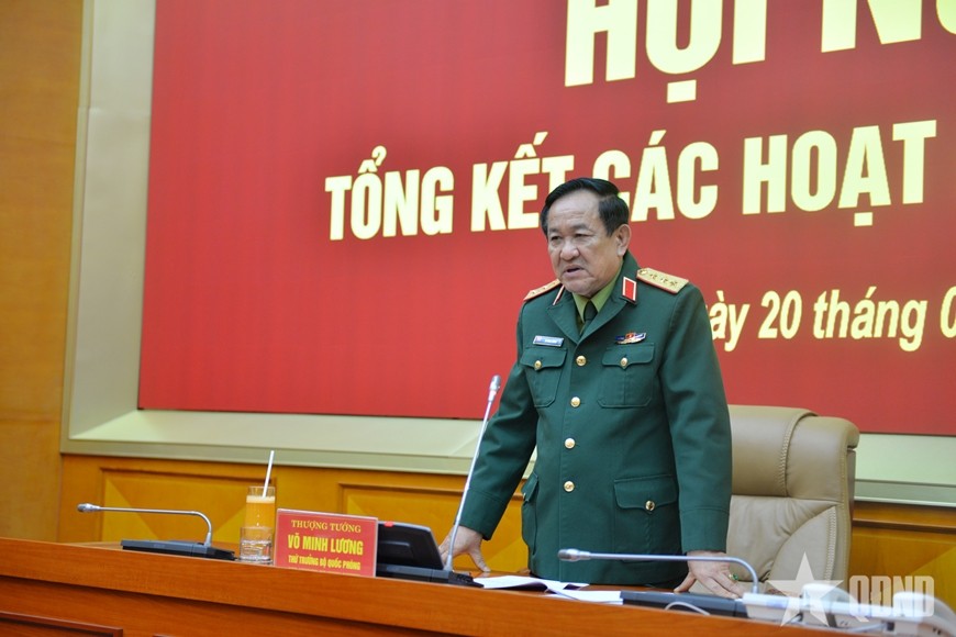Thượng tướng Võ Minh Lương, Ủy viên Trung ương Đảng, Ủy viên Thường vụ Quân ủy Trung ương, Thứ trưởng Bộ Quốc phòng, phát biểu kết luận hội nghị. - Ảnh: QĐND
