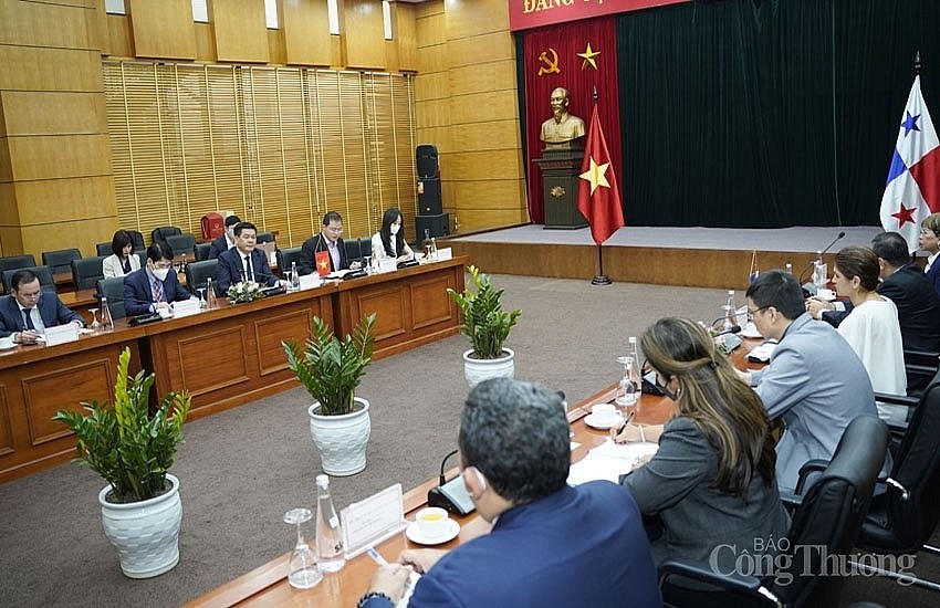 | Phái đoàn Panama do Bộ trưởng Bộ Ngoại giao Erika Mouynes làm trưởng đoàn, trong buổi làm việc với Bộ trưởng Bộ Công Thương Việt Nam Nguyễn Hồng Diên ngày 6/4/2022. |