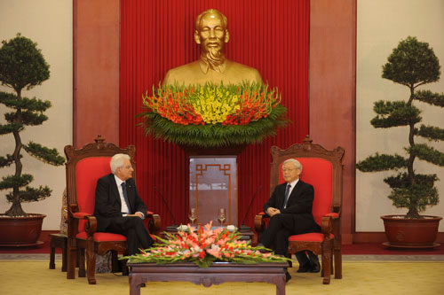 Tổng Bí thư Nguyễn Phú Trọng hoan nghênh và đánh giá cao chuyến thăm của Tổng thống Sergio Mattarella, coi đây là bước phát triển mới trong quan hệ tốt đẹp giữa hai nước, biểu hiện cụ thể của quan hệ đối tác chiến lược Việt Nam-Italy. Tổng Bí thư cảm ơn tình đoàn kết và sự ủng hộ quý báu của nhân dân Italy đối với Việt Nam trong đấu tranh giành độc lập trước đây, cũng như trong xây dựng và phát triển đất nước ngày nay; đánh giá cao những nỗ lực của Italy trong việc khắc phục tác động của khủng hoảng kinh tế cũng như tham gia tích cực vào việc giải quyết những thách thức chung mà châu Âu đang đối mặt; góp phần củng cố niềm tin đối với triển vọng phát triển của Liên minh châu Âu.