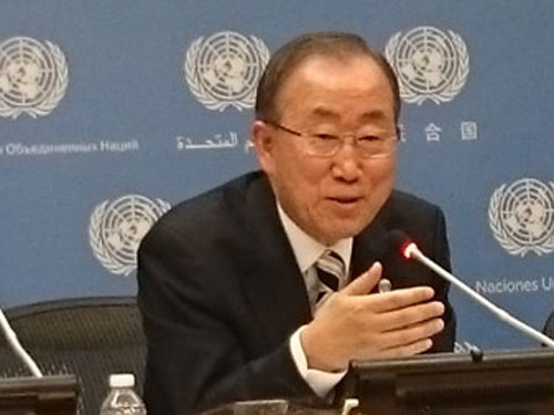 Tổng thư ký LHQ Ban Ki-moon: Như tôi đã nói, hơn 140 nguyên thủ và lãnh đạo các chính phủ sẽ tham dự trong phiên họp này. Và khi nói đến cuộc họp thượng đỉnh về biến đổi khí hậu, chỉ trong một ngày, hơn 120 nguyên thủ và lãnh đạo các chính phủ sẽ góp mặt.