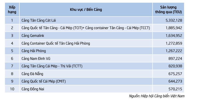 Theo Báo cáo Logistics Việt Nam năm 2024, xếp hạng cảng theo sản lượng thông qua năm 2023 tại Việt Nam thể hiện sự phát triển mạnh mẽ của các cảng lớn trong cả nước, đặc biệt là ở các vùng kinh tế trọng điểm như miền Nam và miền Bắc.