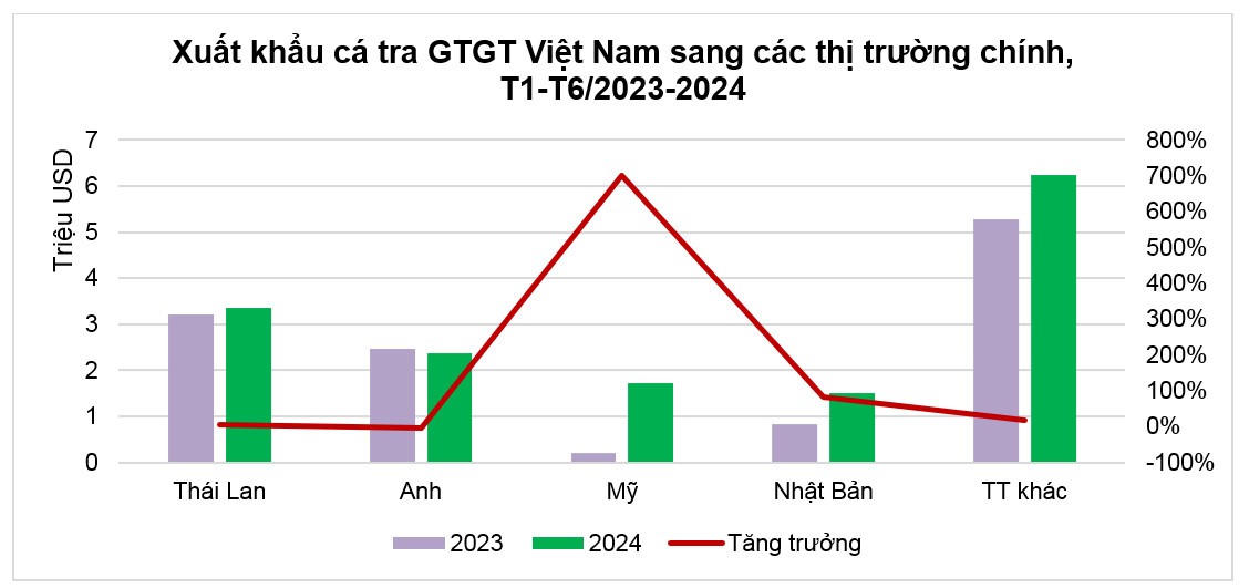 Thái Lan là thị trường tiêu thụ nhiều nhất cá tra giá trị gia tăng của Việt Nam trong nửa đầu năm nay với giá trị hơn 3 triệu USD, tăng 4% so với cùng kỳ năm ngoái, chiếm 19% tỷ trọng trong tổng xuất khẩu sản phẩm này sang các thị trường. Tháng 3/2024 ghi nhận là tháng xuất khẩu cá tra giá trị gia tăng sang Thái Lan đạt giá trị cao nhất, với hơn 800 nghìn USD, tăng 86% so với cùng kỳ năm 2023. Sau khi tăng gấp rưỡi vào tháng 4/2024, thị trường này không nhập khẩu cá tra giá trị gia tăng từ Việt Nam trong tháng 5/2024. Tuy nhiên, tháng 6/2024 Thái Lan tăng nhập khẩu trở lại, gấp đôi so với cùng kỳ năm ngoái, và đạt hơn 700 nghìn USD.