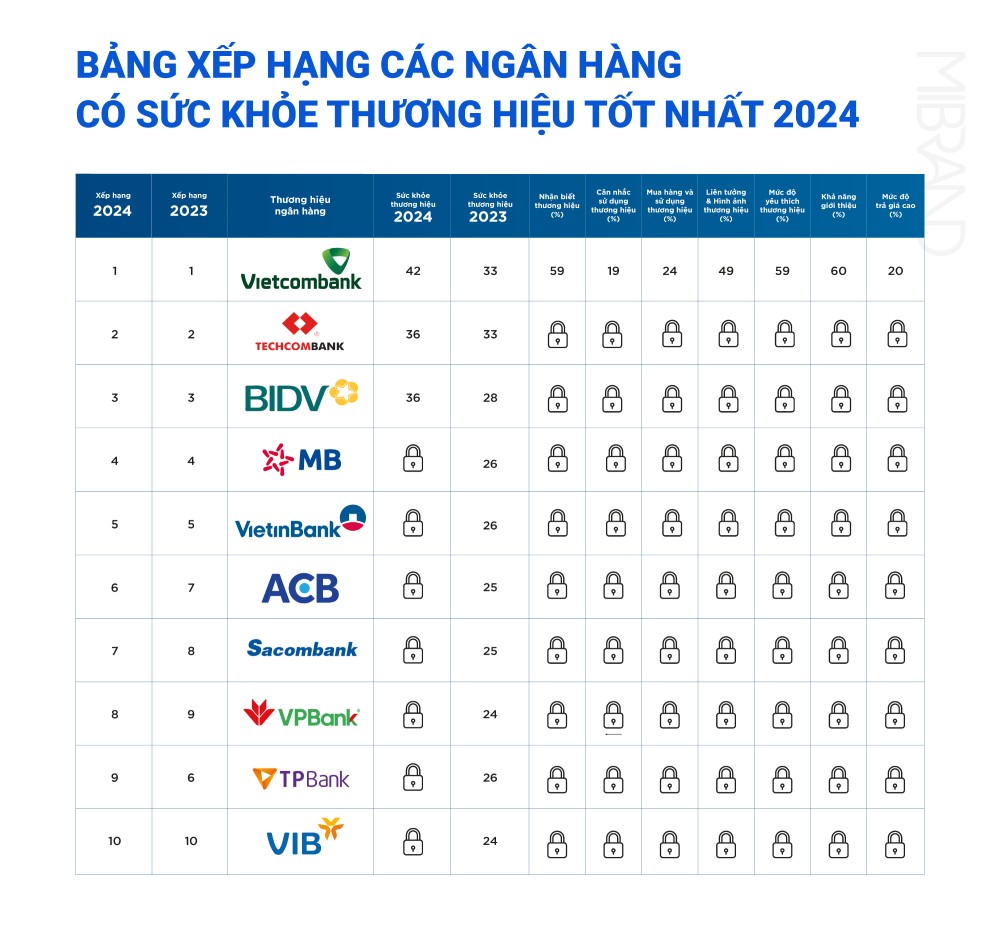 Theo báo cáo, trong năm 2024, bảng xếp hạng Sức khỏe thương hiệu ngân hàng Việt Nam 2024 ít có sự thay đổi. Vietcombank, Techcombank và BIDV vẫn tiếp tục giữ vị trí dẫn đầu.