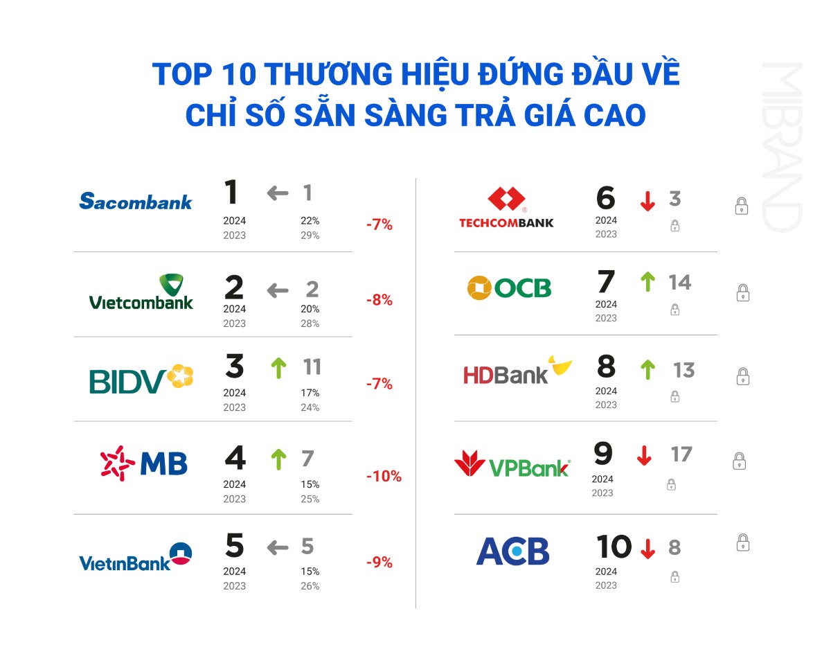 Trong khi đó, Sacombank giữ vững phong độ khi là ngân hàng đứng đầu về chỉ số sẵn sàng trả giá cao, nhờ sự cố gắng nâng cao chất lượng dịch vụ để phù hợp với người tiêu dùng.