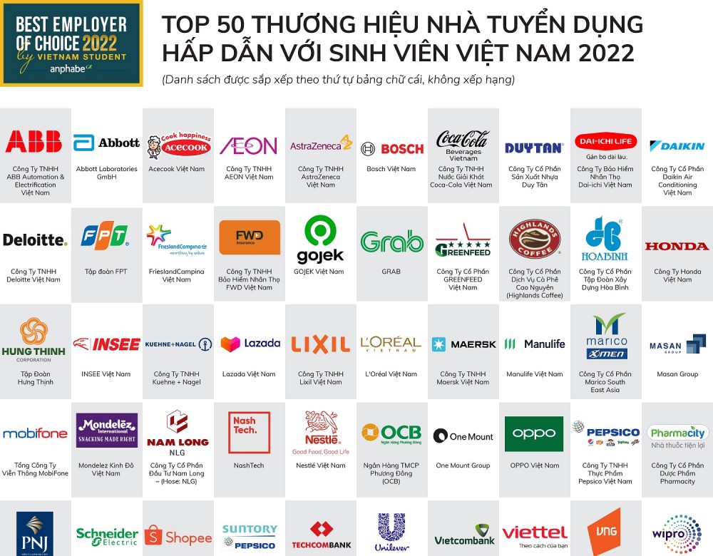 | Danh sách top 50 Thương hiệu Nhà tuyển dụng hấp dẫn với sinh viên Việt Nam 2022 do Anphabe bình chọn |