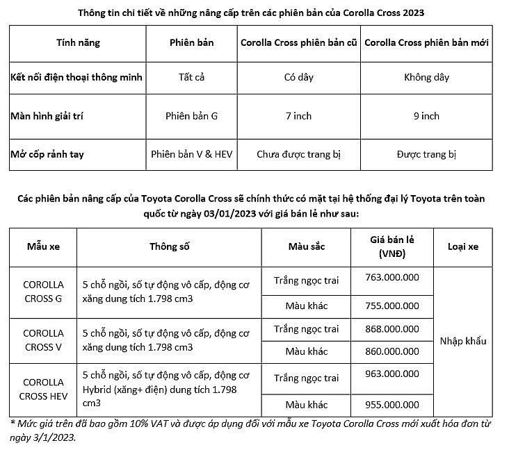 Kể từ tháng 1/2023, với những nâng cấp về trang bị và tính năng mới (như: Kết nối không dây điện thoại thông minh trên tất cả phiên bản, tăng kích thước màn hình giải trí với phiên bản G, bổ sung tính năng mở cốp rảnh tay với phiên bản V & HEV), Corolla Cross hứa hẹn sẽ đem đến cho khách hàng những trải nghiệm tuyệt vời.