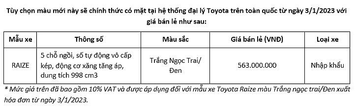 Tiếp nối thành công của mẫu xe Toyota Raize trong năm 2022 với hơn 6.800 xe được giao tới tay khách hàng trong năm 2022, Toyota đã bổ sung thêm màu ngoại thất trắng ngọc trai/đen trên mẫu xe này nhằm tăng thêm lựa chọn cho khách hàng trẻ.