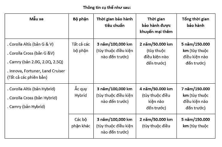 Ngoài ra, nhân dịp chào đón năm mới, Toyota Việt Nam tiếp tục triển khai chương trình ưu đãi tặng “Gói gia hạn bảo hành 2 năm hoặc 50.000 km (tùy điều kiện nào đến trước)” dành cho khách hàng mua một số dòng xe Toyota từ ngày 1/1/2023 đến hết ngày 31/12/2023.
