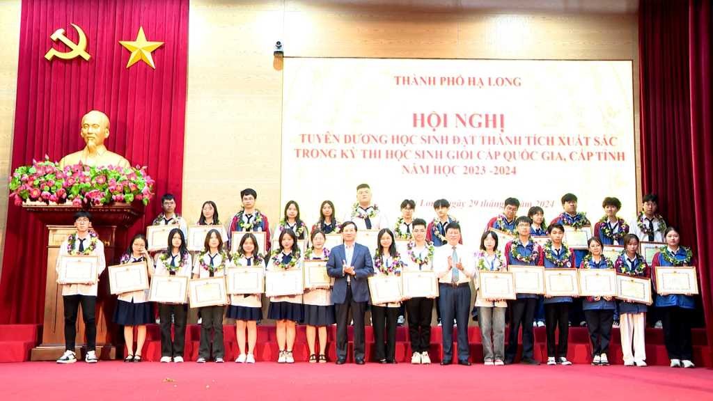 | Tổ chức khen thưởng học sinh đạt thành tích xuất sắc trong kỳ thi học sinh giỏi cấp quốc gia, cấp tỉnh năm học 2023-2024 tại TP. Hạ Long. Ảnh: Ban Tuyên giáo Hạ Long |
