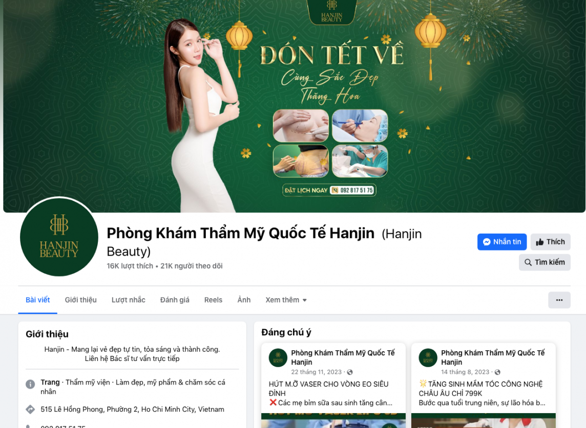 | Một quảng cáo về Phòng khám Thẩm mỹ Quốc tế HanJin trên mạng xã hội. |