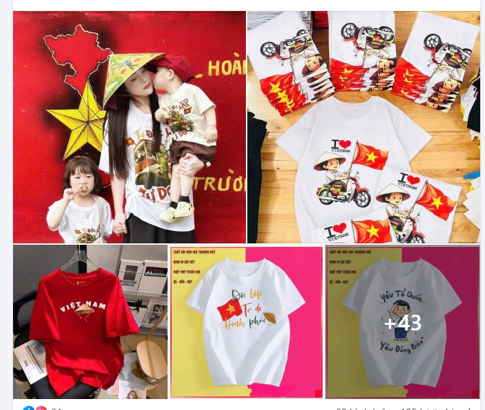 Một số shop online còn thiết kế riêng các mẫu cho gia đình, nhóm bạn thân hoặc lớp học với đa dạng kiểu dáng từ tay ngắn, tay dài đến form oversize năng động. Chỉ cần gõ từ khóa “áo cờ đỏ, sao vàng”, người tiêu dùng dễ dàng tiếp cận hàng nghìn kết quả với mức giá, mẫu mã phong phú.