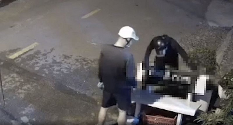 | Các đối tượng xịt sơn vẽ quảng cáo trang web cá độ trên ghế đá (ảnh cắt từ camera người dân) |