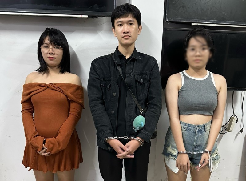 | Các đối tượng Nguyễn Thị Thiên Nhi, Lê Quốc Doanh, Nguyễn Đình K.A. tại cơ quan công an. |