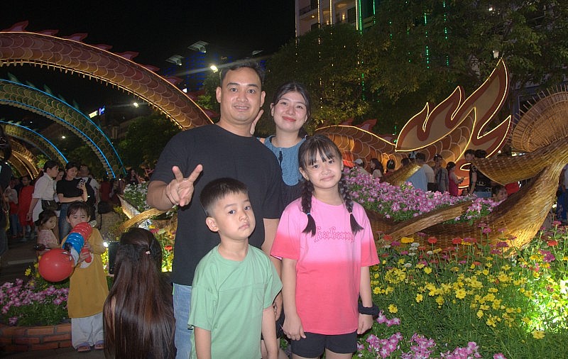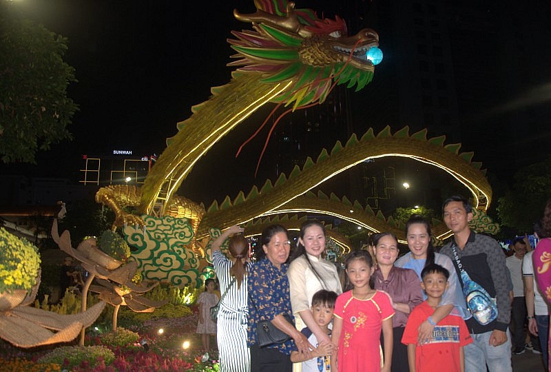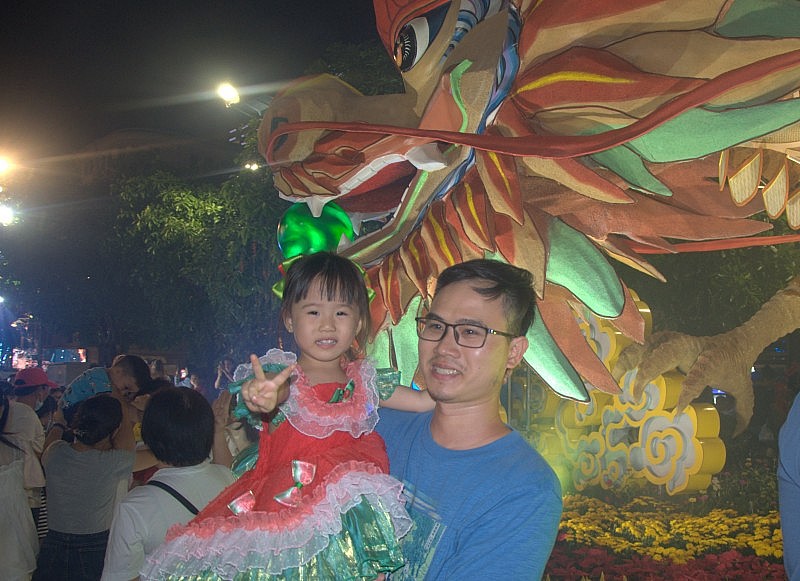 | Linh vật rồng đường hoa Nguyễn Huệ được các ông bố, bà mẹ thích thú cho bé chụp hình |