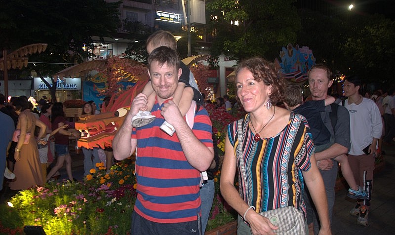 | Người dân rất phấn khởi khi là những người đầu tiên được vào tham quan đường hoa Nguyễn Huệ sau lễ khai mạc tối ngày 7/2 (28 Tết) |