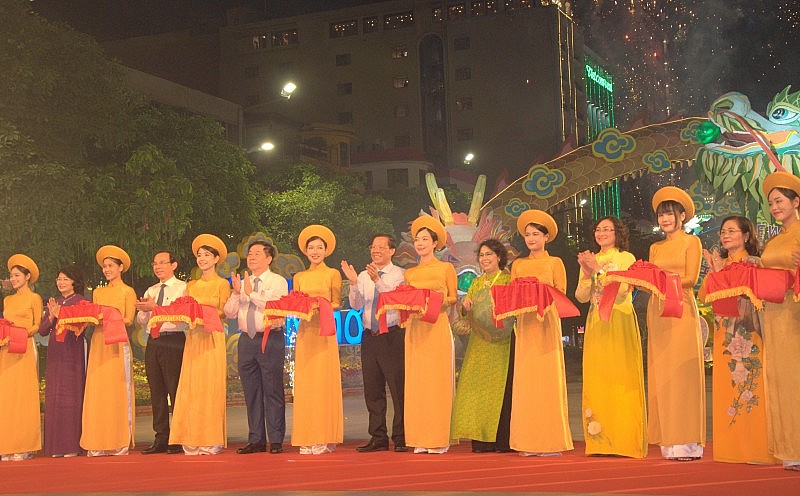 | Các đại biểu thực hiện nghi thức cắt băng khai mạc đường hoa Nguyễn Huệ Tết Giáp Thìn 2024 |