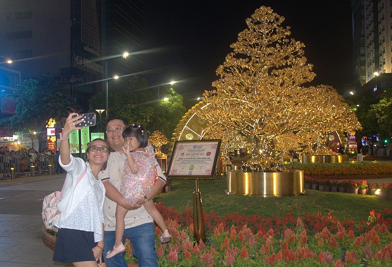 | Người dân thích thú chụp ảnh với cây hoàng kim (bằng đồng mạ vàng 24K) lần đầu tiên xuất hiện trên đường hoa Nguyễn Huệ |