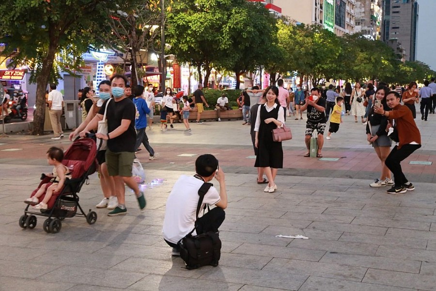 | Phố đi bộ Nguyễn Huệ, quận 1 thu hút khách tham quan vui chơi |