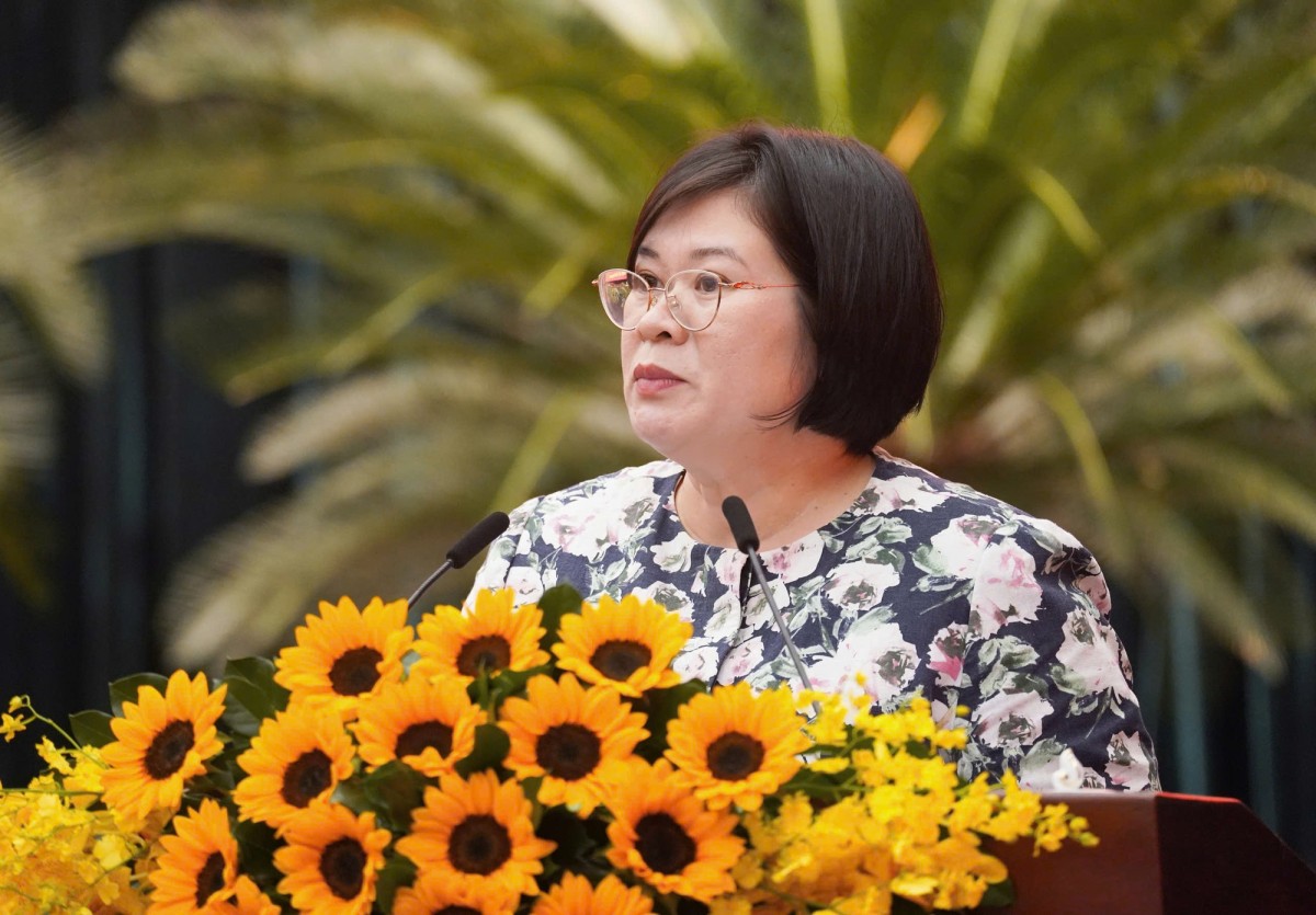 | Bà Văn Thị Bạch Tuyết, Trưởng Ban Tổ chức Thành ủy TP. Hồ Chí Minh thông tin tại hội nghị - (Ảnh: Nguyên Vũ) |