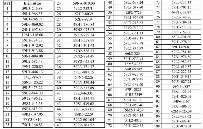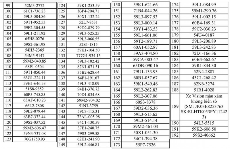 Trên đây là danh sách biển số của 192 chiếc xe đã được công an thu giữ tại tiệm cầm đồ Nhuận Phát.