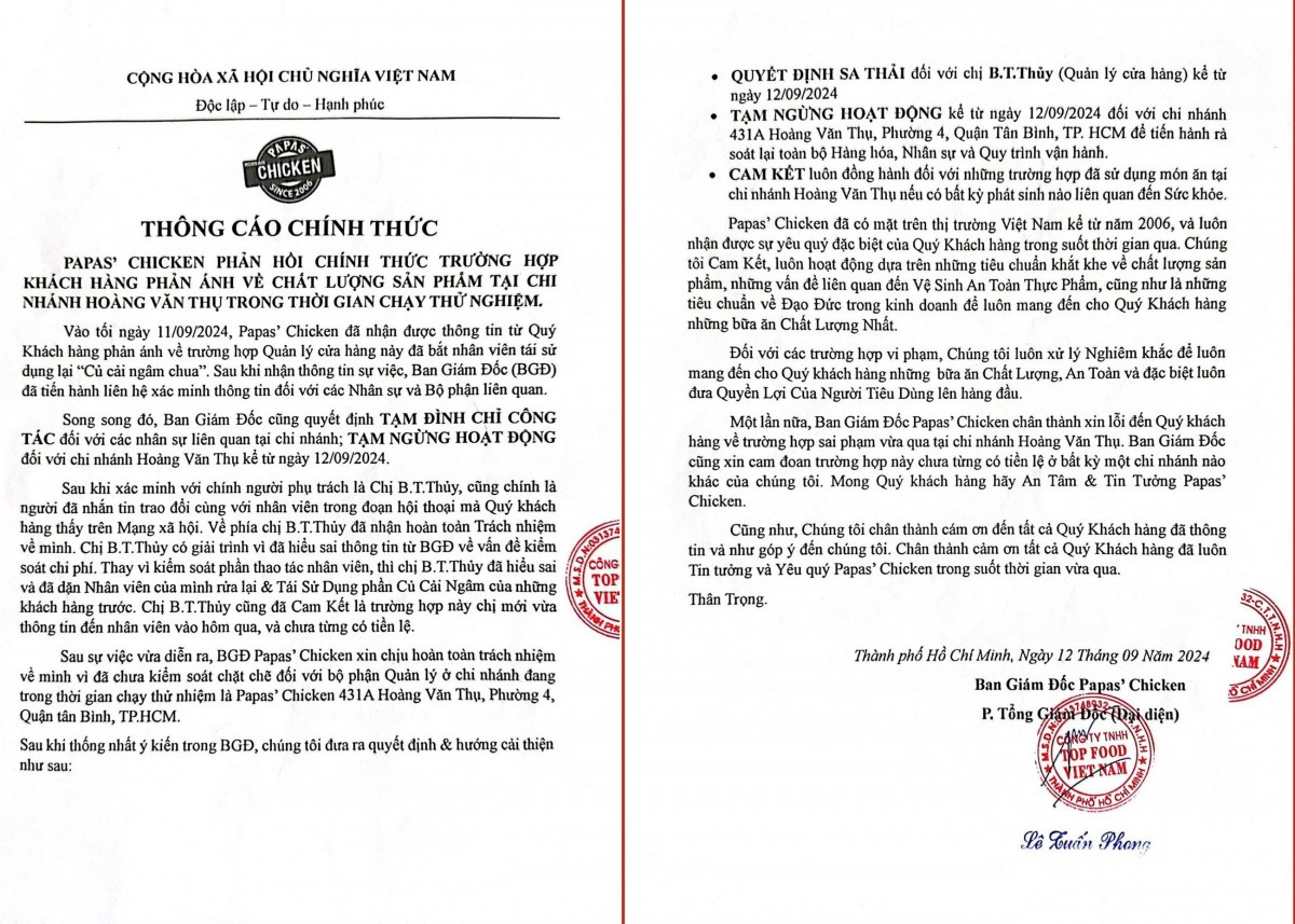 “Song song đó, Ban giám đốc cũng quyết định tạm đình chỉ công tác đối với các nhân sự liên quan tại chi nhánh; tạm ngừng hoạt động đối với chi nhánh Hoàng Văn Thụ kể từ ngày 12/09/2024”, Papas’ Chicken thông báo.