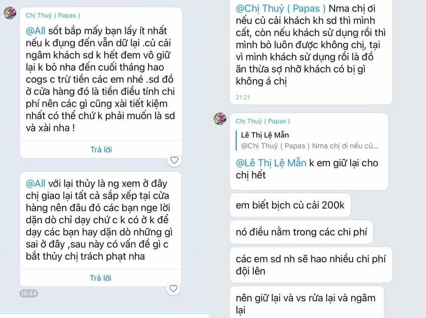 Các tin nhắn cho thấy cuộc tranh cãi về việc quản lý yêu cầu nhân viên “tái sử dụng” thực phẩm củ cải muối sau sử dụng của khách cũ dùng lại cho đợt khách mới, cũng như vấn đề đảm bảo vệ sinh an toàn thực phẩm trong quy trình chế biến.