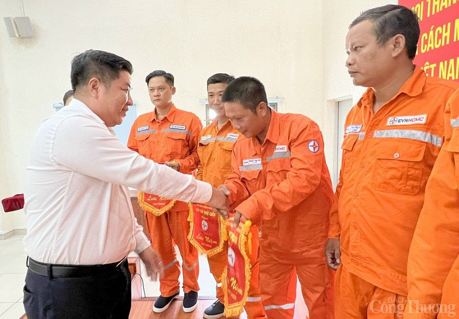 | Ông Luân Quốc Hưng - Phó Tổng giám đốc, Tổng công ty Điện lực TP. Hồ Chí Minh, trao cờ lưu niệm cho đại diện các công nhân thi thợ giỏi |