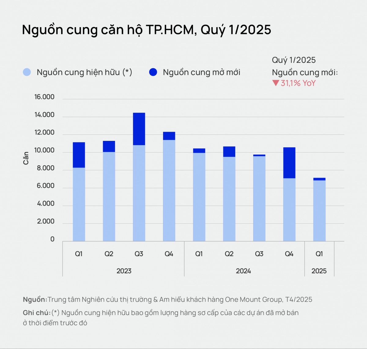 Theo số liệu từ Trung tâm Nghiên cứu thị trường & Am hiểu khách hàng One Mount Group, trong quý I/2025, TP. Hồ Chí Minh chỉ có khoảng 340 căn hộ mở bán mới, giảm tới 31,1% so với cùng kỳ năm trước và trở thành mức thấp nhất kể từ đầu năm 2023. Nguyên nhân chủ yếu đến từ tâm lý thận trọng của các chủ đầu tư trong bối cảnh kinh tế vĩ mô còn nhiều biến động, cùng với kỳ nghỉ Tết Nguyên đán kéo dài khiến tiến độ mở bán chậm lại.