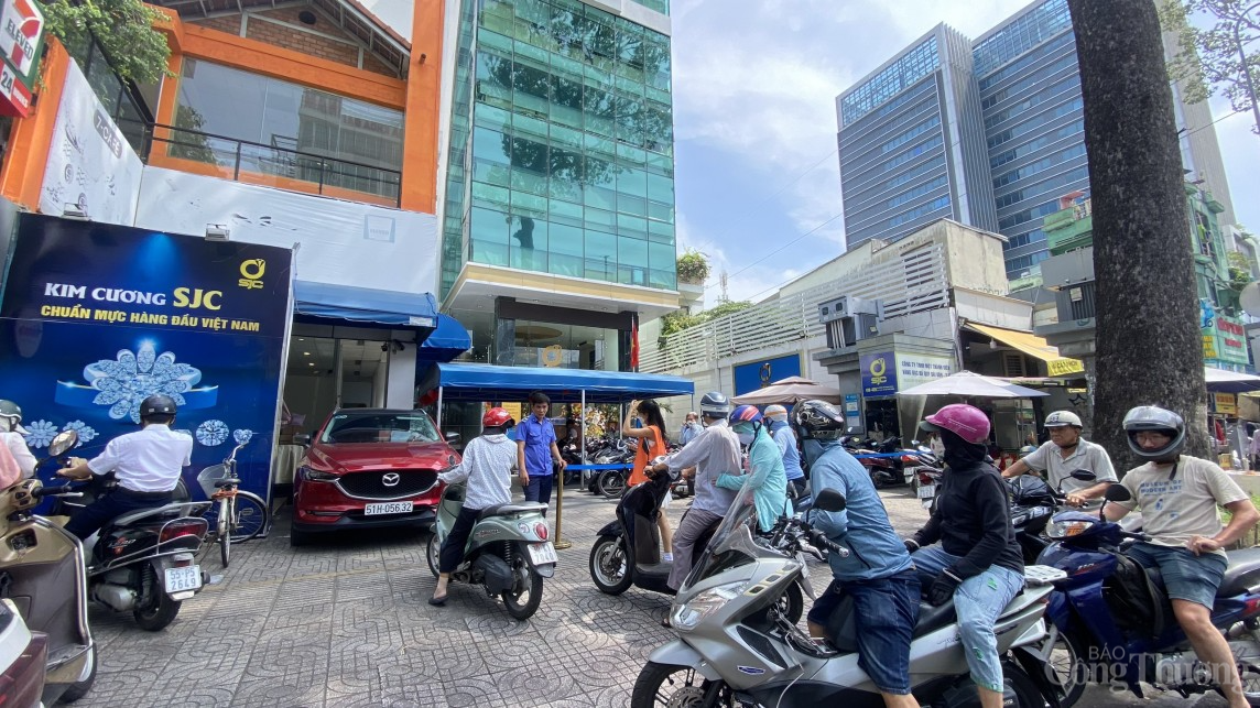 Còn tại Công ty TNHH MTV Vàng bạc đá quý Sài Gòn (SJC) nằm trên đường Nguyễn Thị Minh Khai, quận 3 rất nhộn nhịp. Lượng khách đến quá đông nên đến 10h cùng ngày, nhân viên tại đây thông báo không nhận thêm khách.