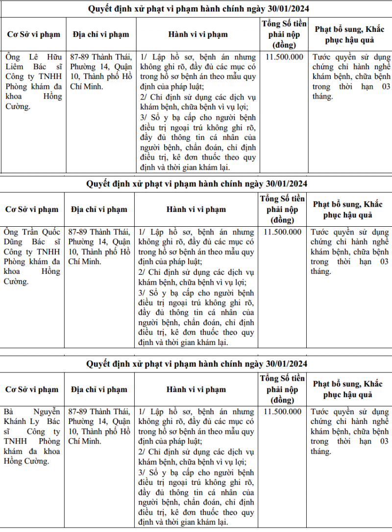 Theo đó, qua quá trình kiểm tra, Thanh tra Sở Y tế TP. Hồ Chí Minh đã ra quyết định xử phạt đối với ông Lê Hữu Liêm, ông Trần Quốc Dũng, bà Nguyễn Khánh Ly, cả 3 cùng là bác sĩ tại Công ty TNHH Phòng khám Đa khoa Hồng Cường, cùng mắc hàng loạt lỗi vi phạm giống nhau.