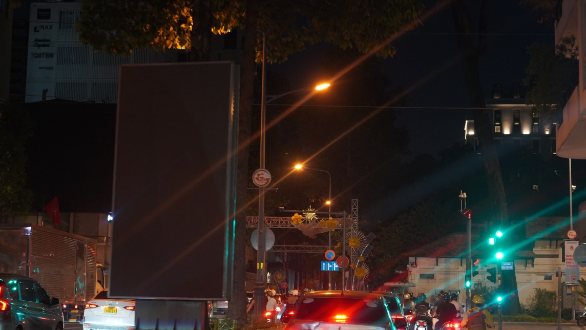 | Bảng hiệu quảng cáo tại tuyến đường Nam Kỳ Khởi Nghĩa, quận 3 đã tắt từ 21 giờ (Ảnh: Duy Đoàn) |
