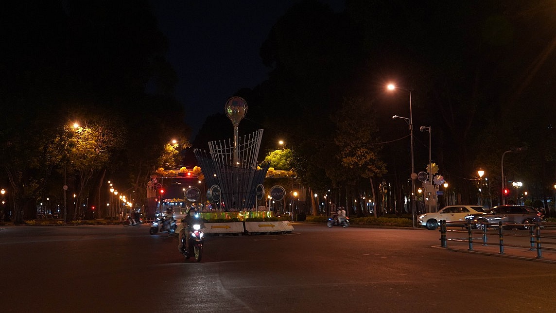 | Đèn trang trí vòng xoay giao lộ Lê Duẩn - Phạm Ngọc Thạch đã tắt sau 22 giờ (Ảnh: Duy Đoàn) |