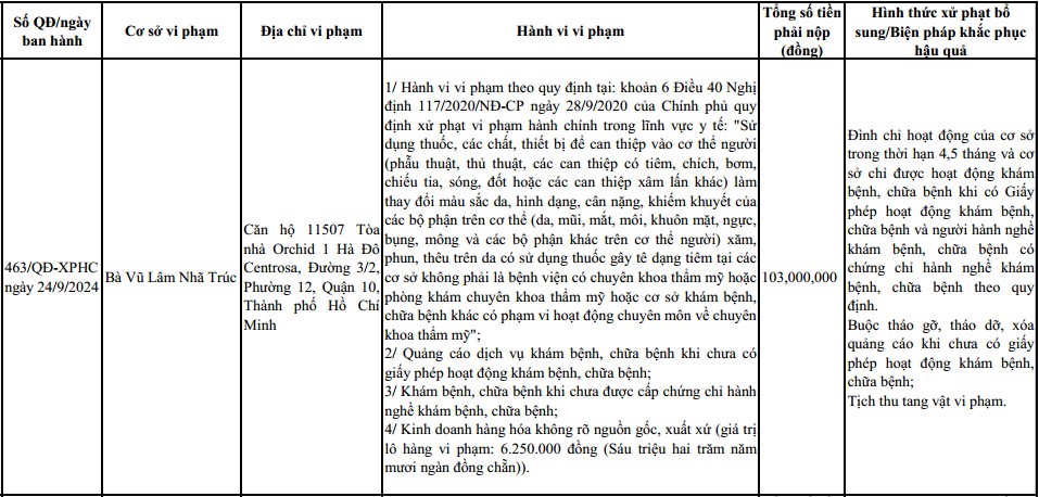 | Thanh tra Sở Y tế TP.HCM xử phạt bà Vũ Lâm Nhã Trúc số tiền 103 triệu đồng, đình chỉ cơ sở 4,5 tháng. Ảnh: Sở Y tế TP.HCM |