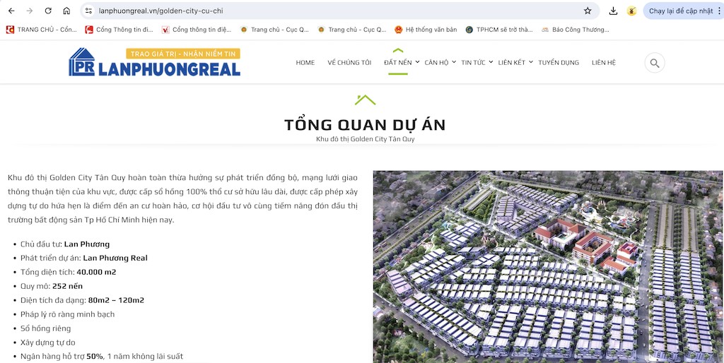 Theo nội dung website, Công ty địa ốc Lan Phương Real khẳng định là chủ đầu tư với tên gọi của dự án là Khu đô thị Golden City Tân Quy với tổng diện tích 40.000 m2 với 252 sản phẩm, phân lô đa dạng 80m2 - 120m2 (vị trí tại ngã tư Tân Quy, thuộc xã Tân Thạnh Tây, huyện Củ Chi).