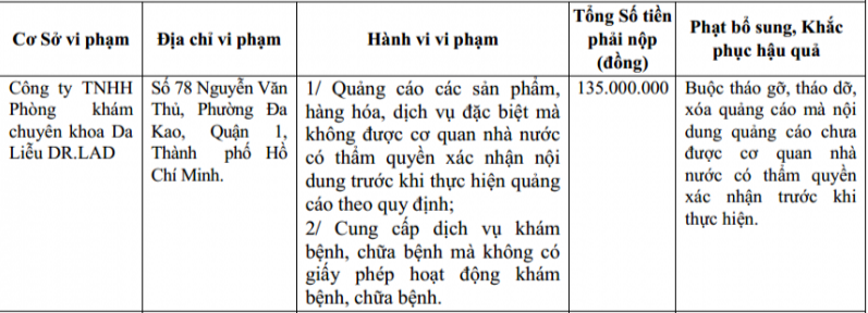 Với những hành vi này, Phòng khám Da liễu DR.LAD bị xử phạt 135 triệu đồng. Đồng thời, Thanh tra Sở Y tế buộc phòng khám này phải tháo dỡ những quảng cáo do vi phạm nêu trên.