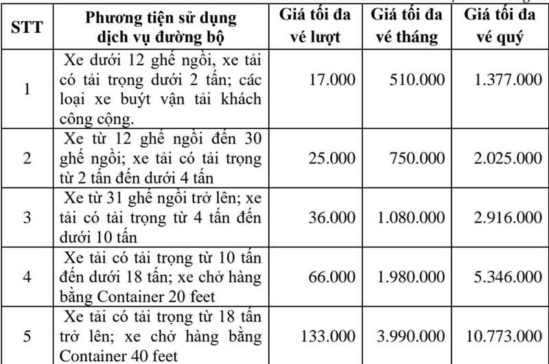 Xe tải có tải trọng từ 18 tấn trở lên, xe chở hàng bằng container 40 feet có giá 133.000 đồng/vé, vé tháng là 3.990.000 đồng/tháng, vé quý là 10.773.000 đồng/quý.