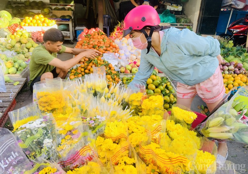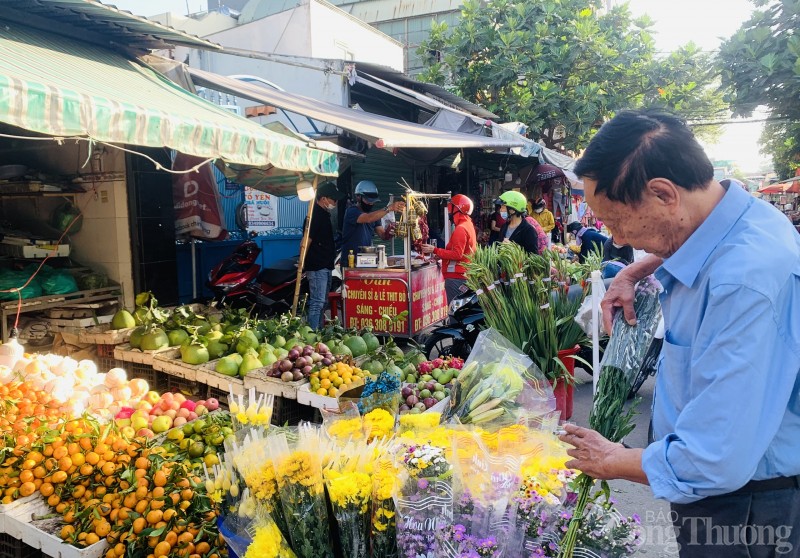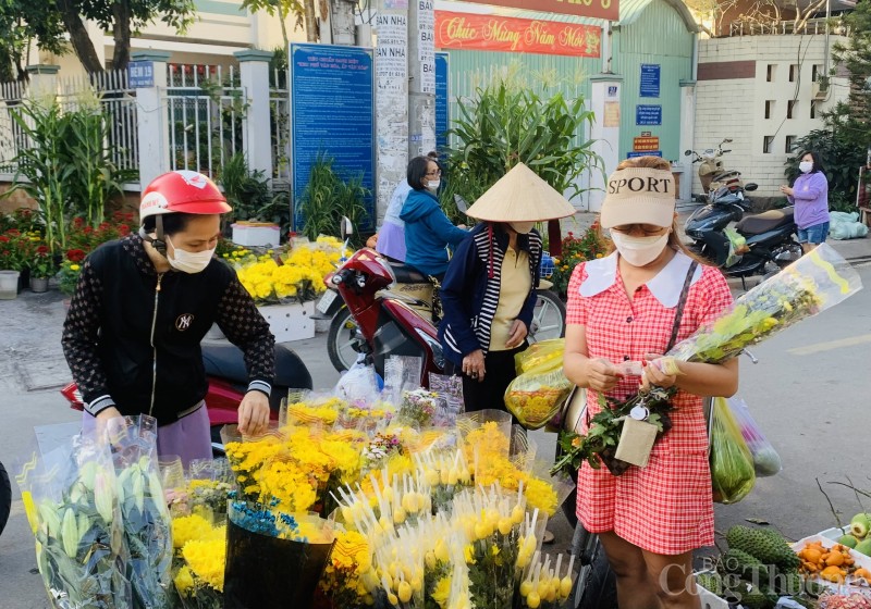 Cùng với trái cây, thực phẩm, nhiều người cũng ghé các sạp mua hoa tươi.